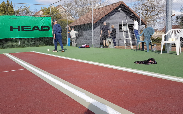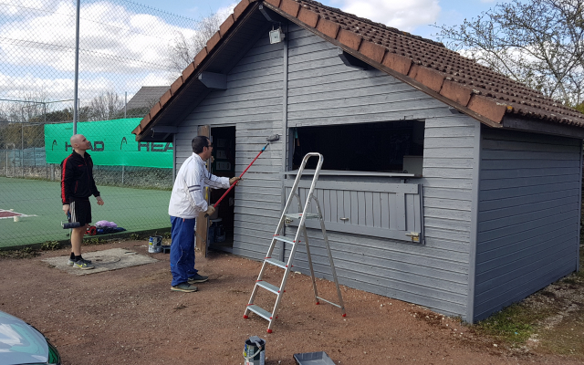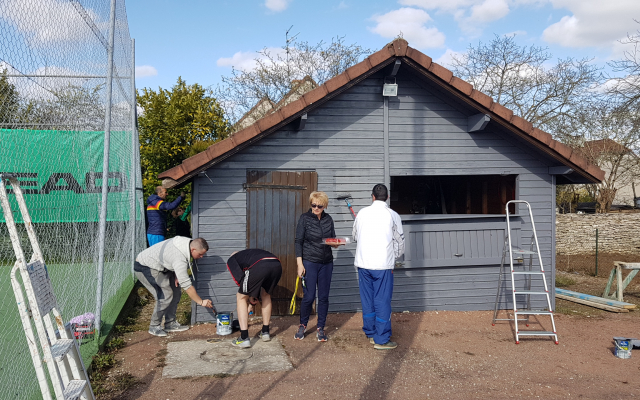 Toute l’équipe de bénévoles du Tennis Club de Bellefond emmenée par son président Monsieur Bonhomme, s’est donnée rendez-vous cette semaine et ce week-end pour redonner un coup de propre au chalet qui fait office de club house et aux terrains eux-mêmes. Un grand nettoyage, un démoussage, suivi d’une peinture complète du chalet et des lignes des cours ont permis de redonner de l’éclat à cette structure de la commune. La pose de pare-vue a complété ces journées de travaux.