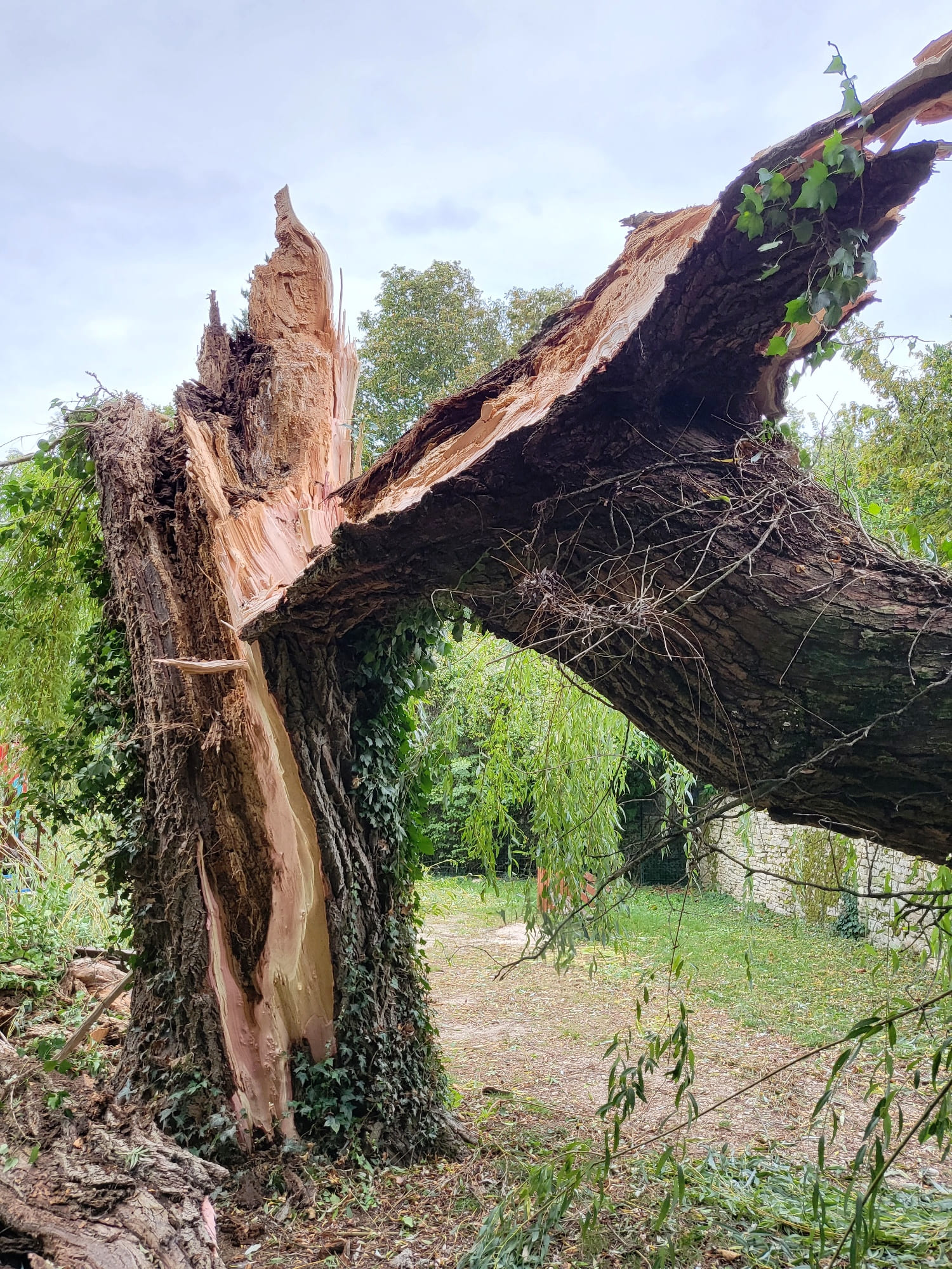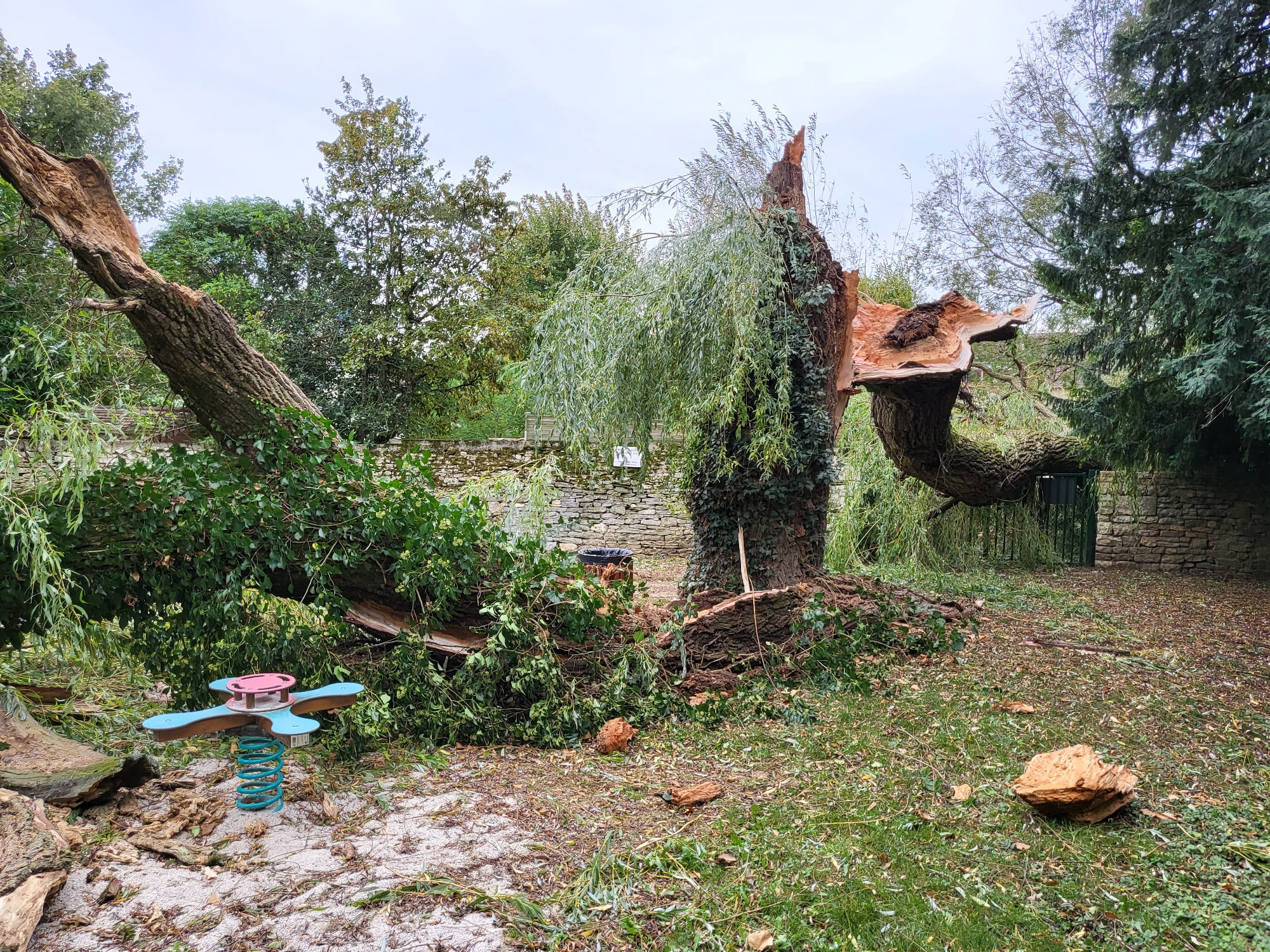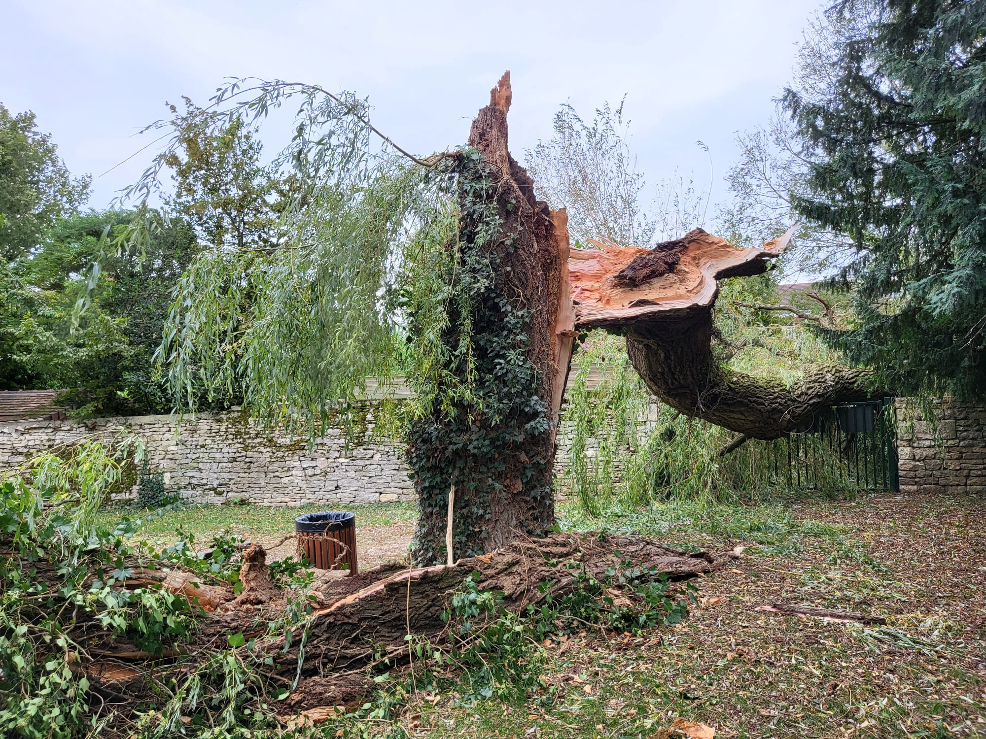 Dans la nuit du samedi 2 au dimanche 3 octobre, suite au violent coup de vent que nous avons eu, le magnifique saule qui se situait dans le petit parc derrière la mairie s’est littéralement coupé en deux. Heureusement, aucun blessé n’est à déplorer. Seuls les jeux pour enfants ont été complètement détruits ainsi que le portail d’entrée. Un travail d’élagage va démarrer dès lundi 4 octobre pour dégager l’entrée et effectuer une remise en état du parc pour une réouverture dès que possible.