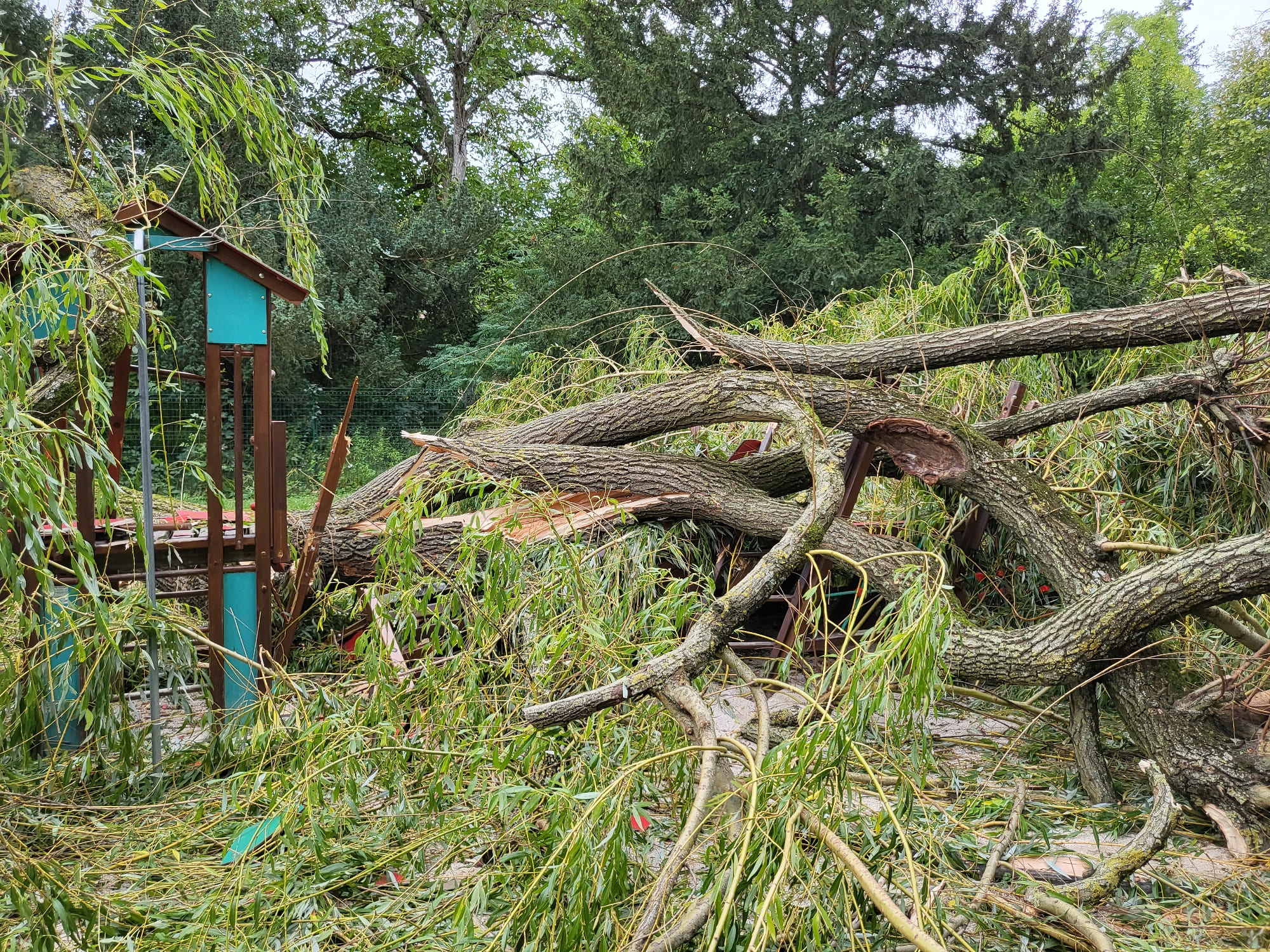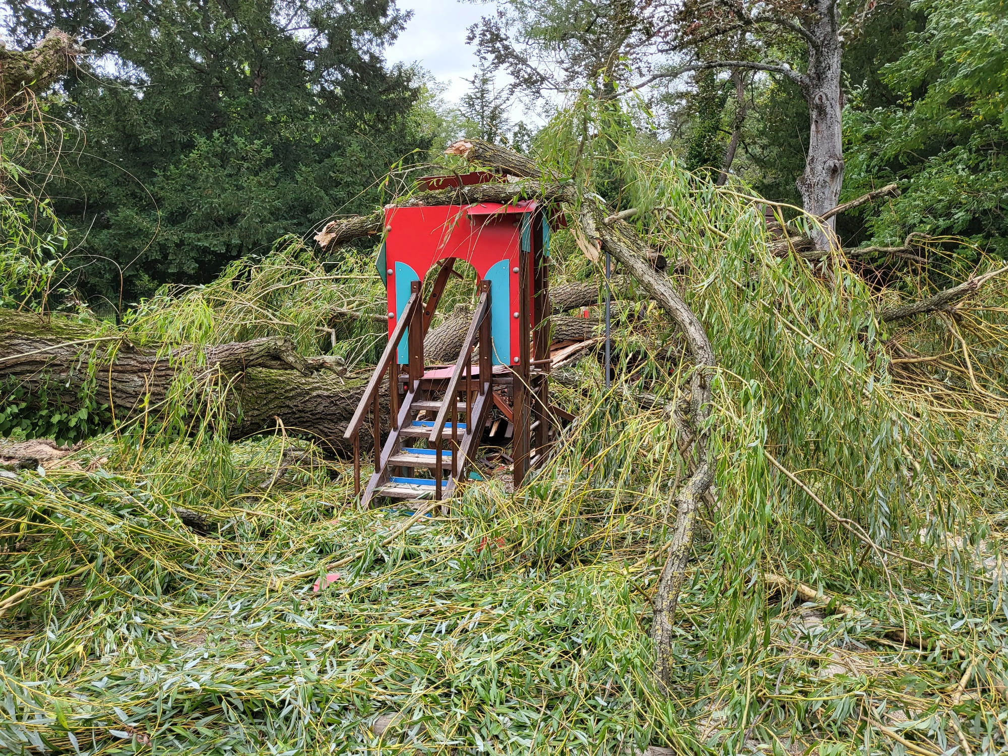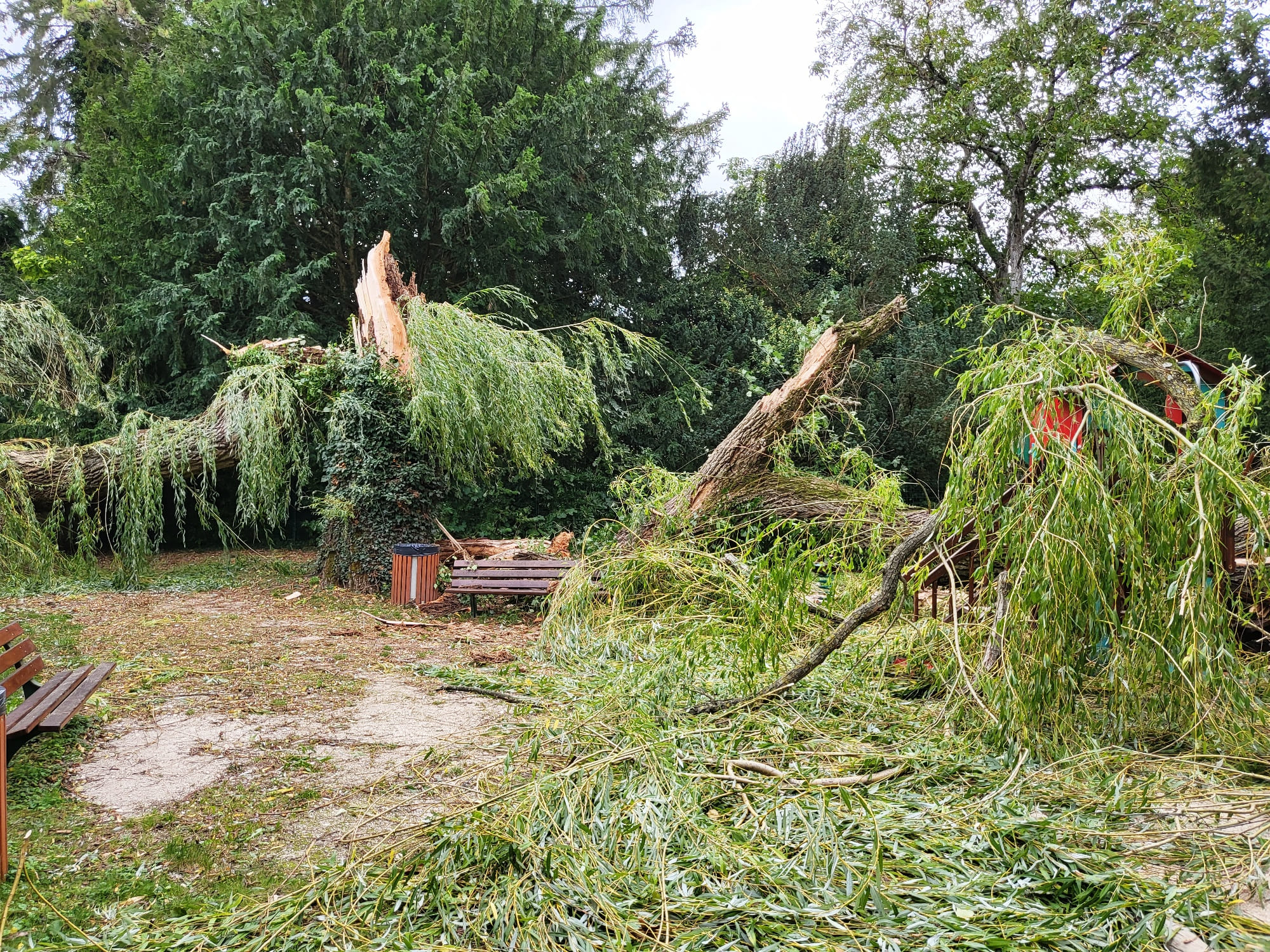 Dans la nuit du samedi 2 au dimanche 3 octobre, suite au violent coup de vent que nous avons eu, le magnifique saule qui se situait dans le petit parc derrière la mairie s’est littéralement coupé en deux. Heureusement, aucun blessé n’est à déplorer. Seuls les jeux pour enfants ont été complètement détruits ainsi que le portail d’entrée. Un travail d’élagage va démarrer dès lundi 4 octobre pour dégager l’entrée et effectuer une remise en état du parc pour une réouverture dès que possible.