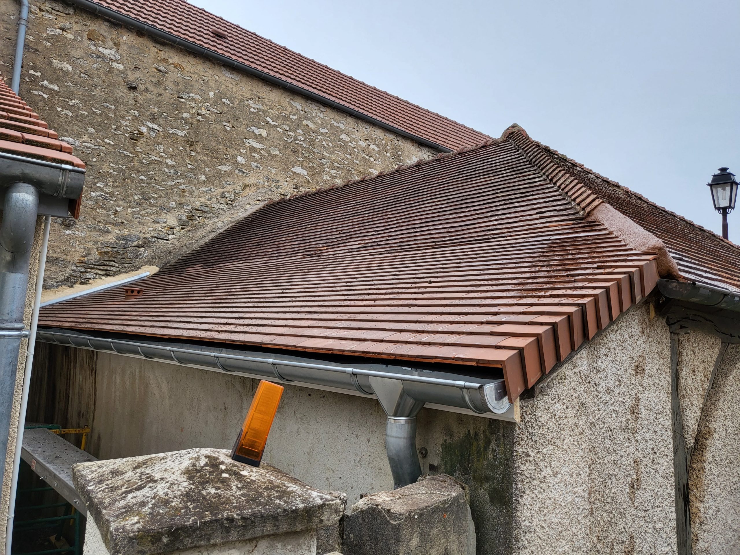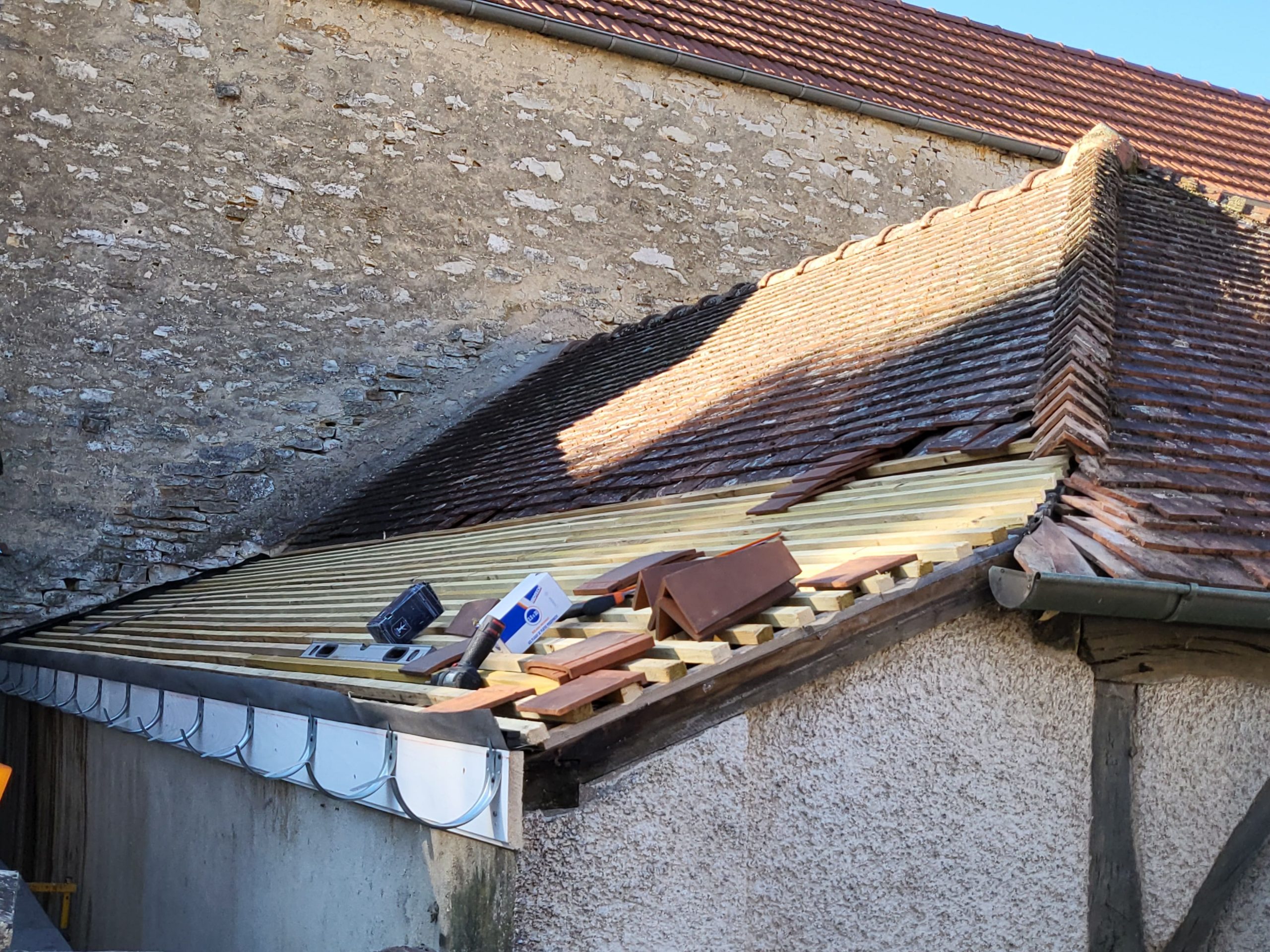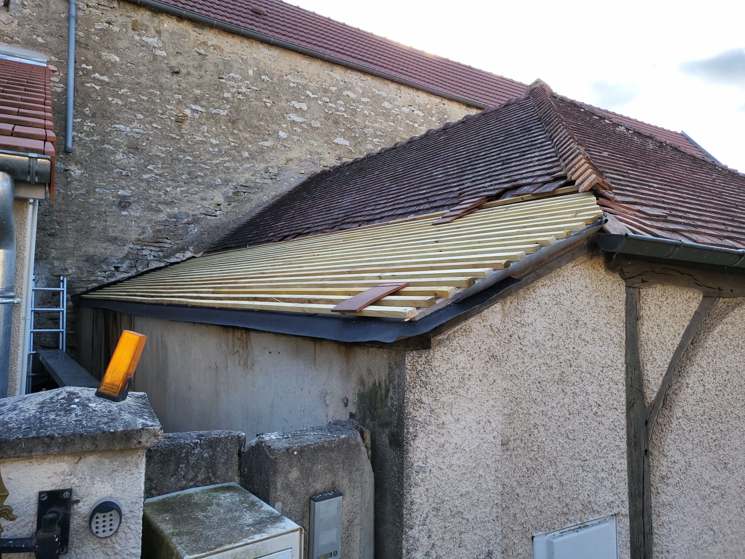 Une rénovation de la partie abîmée, à l’aide de tuiles cette fois-ci, et un nettoyage de la totalité du toit ont permis de mettre hors d’eau le local.