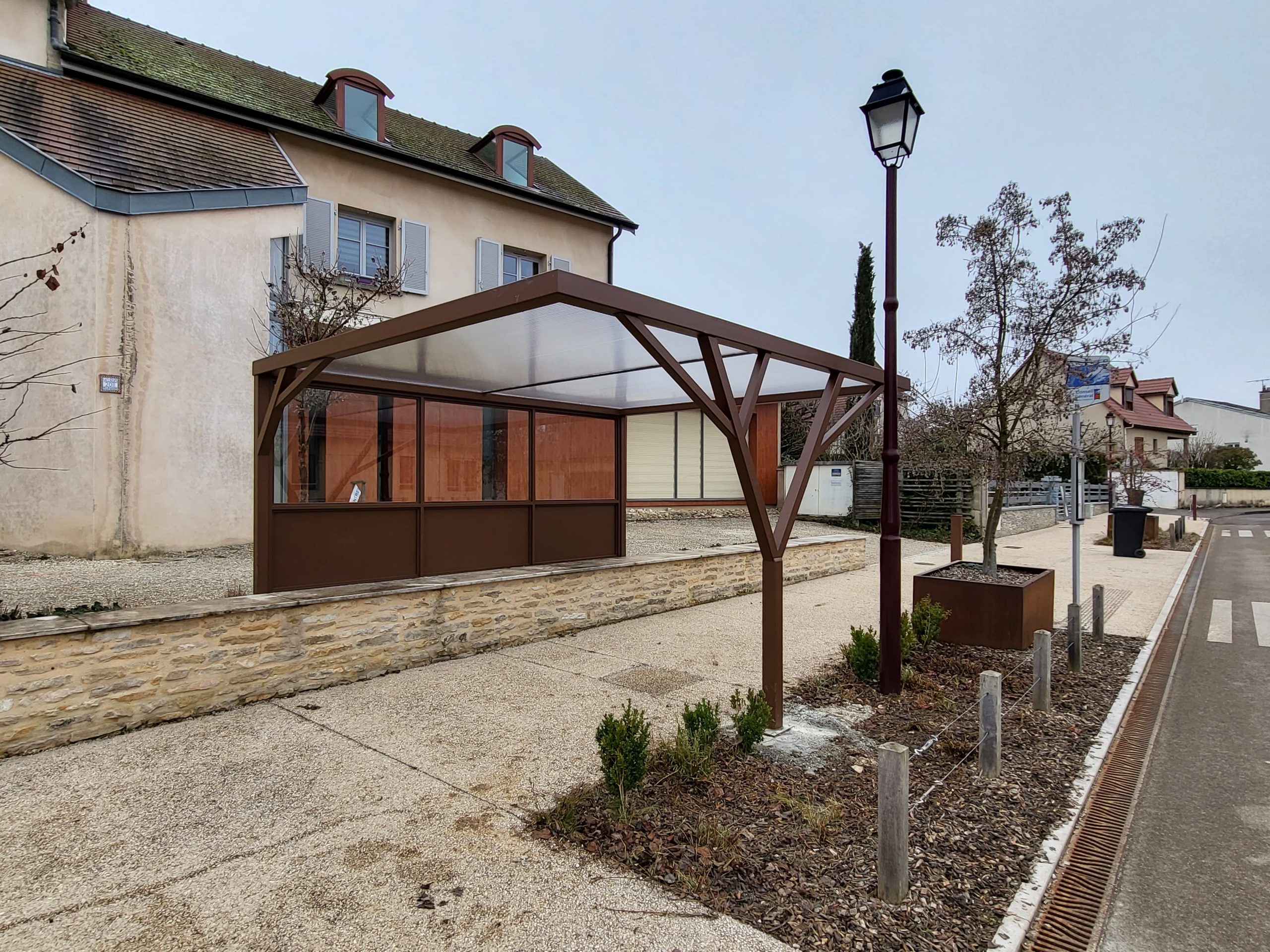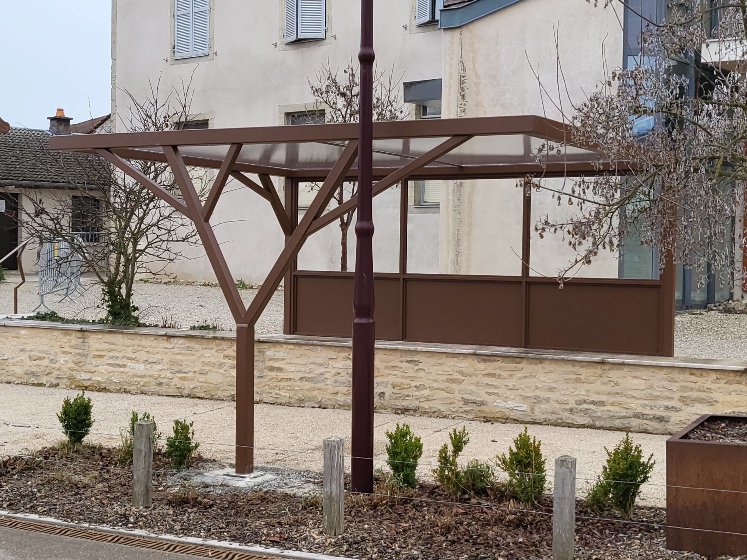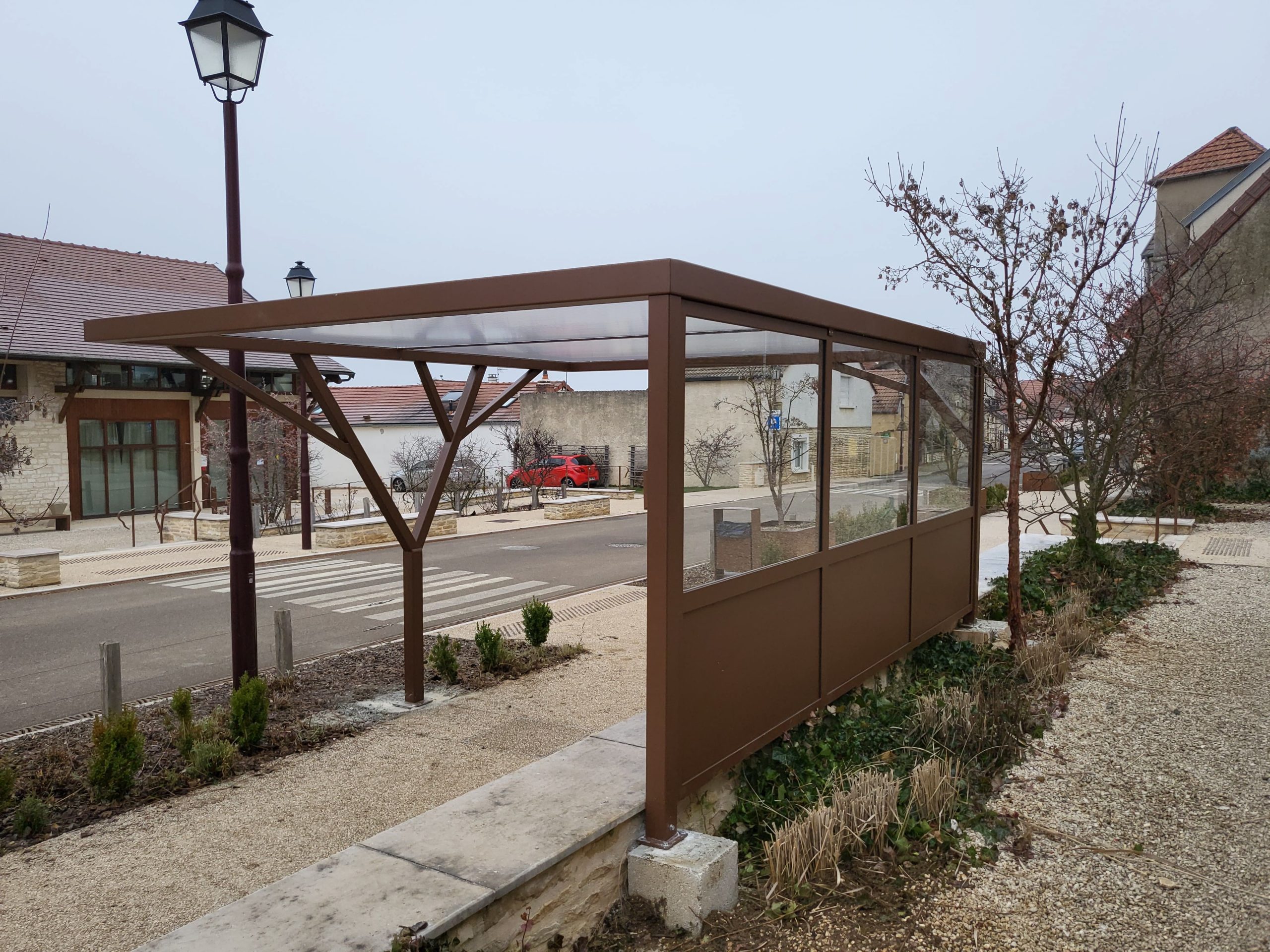 C’est la société PITAULT de Norges la Ville, sur un dessin de l’agence JDM Paysagistes, qui a réalisé et installé cet abri au design unique et parfaitement intégré à la place du village.