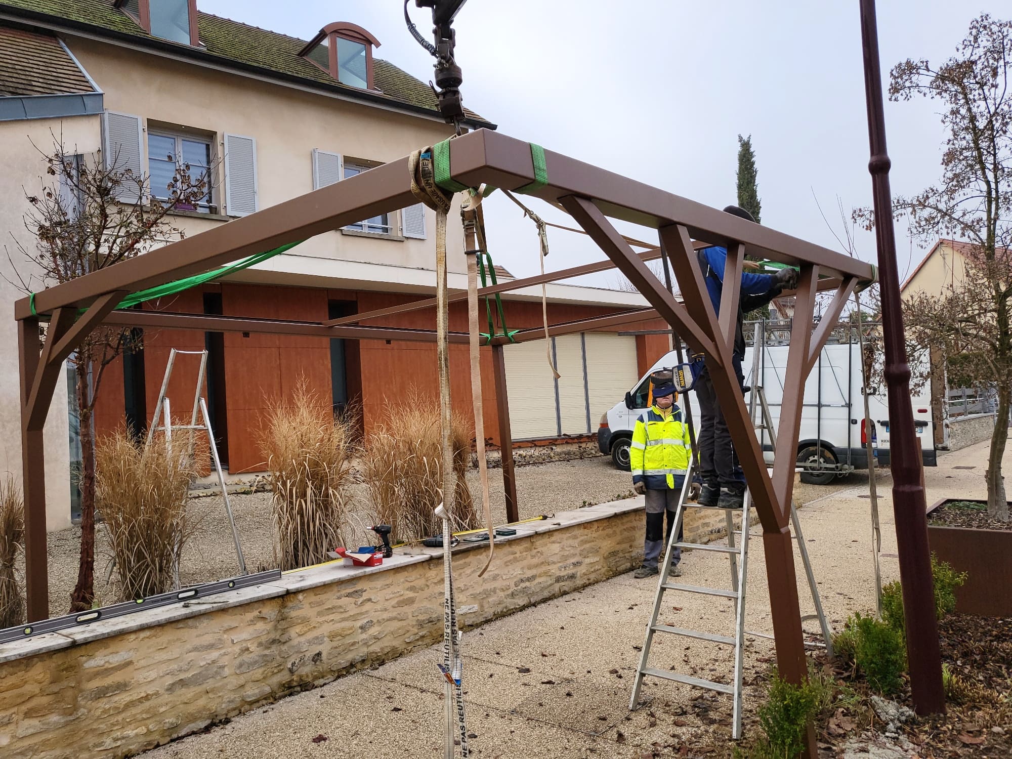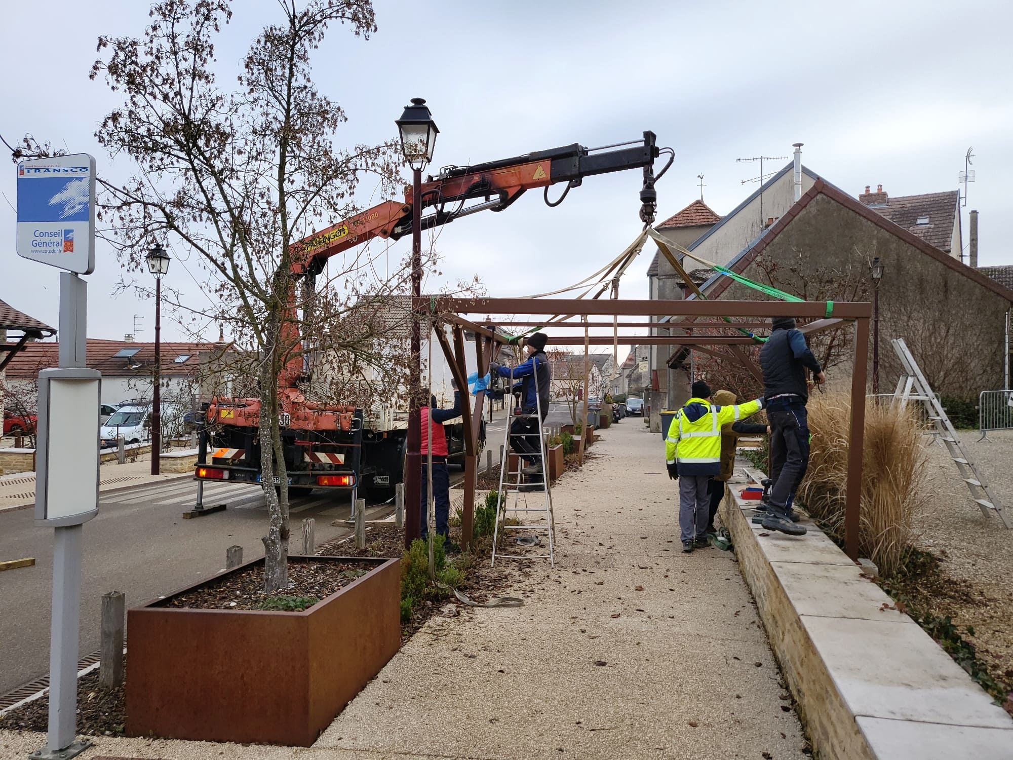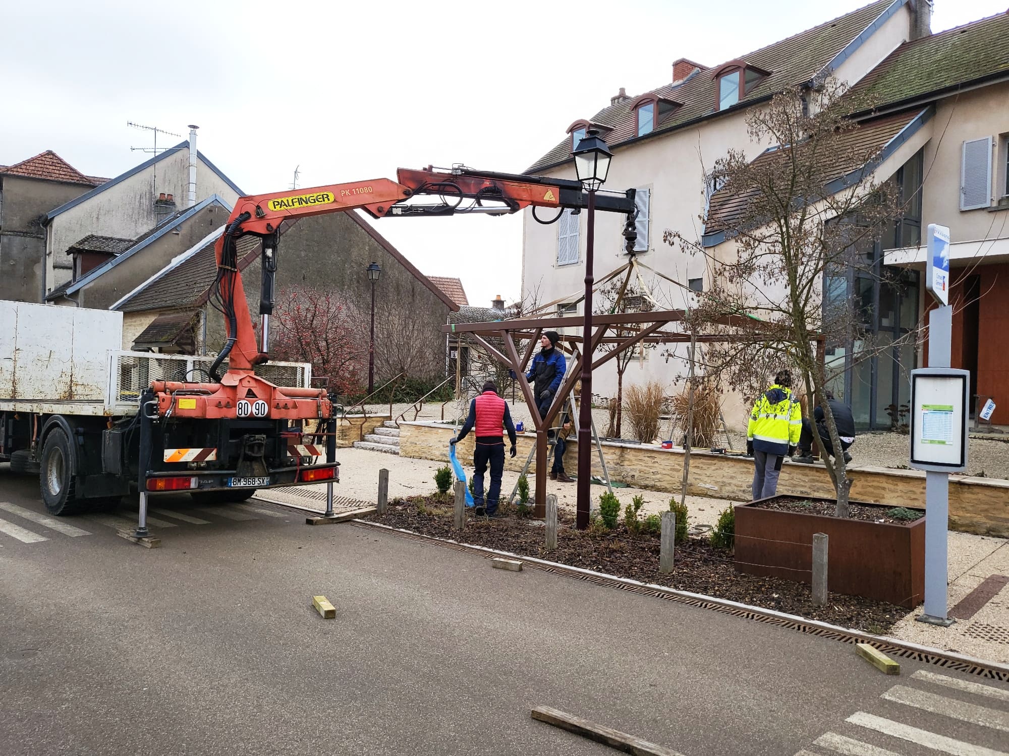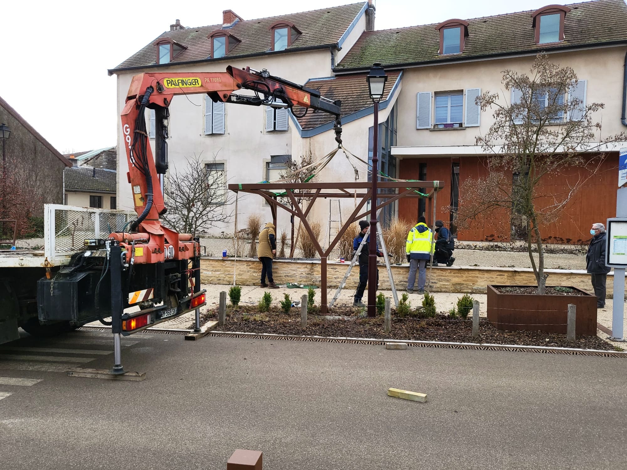C’est la société PITAULT de Norges la Ville, sur un dessin de l’agence JDM Paysagistes, qui a réalisé et installé cet abri au design unique et parfaitement intégré à la place du village.